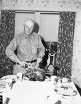 Homer P. Lee Senior, co-owner of ranch, carving turkey from his flock of 3,000. Mr. Lee is standing at the head of a set table. He is wearing a button-up shirt, necktie and trousers. There is a window with drapes behind him. Published in the Fort Worth Star-Telegram morning edition, October 28, 1945.