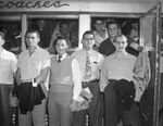Aggie squad members are shown exiting special buses that brought them to Fort Worth, Texas. Left to right, they are Bob Butchofsky of Ysleta, Texas, M. Mathews of San Antonio, Texas, Grant Darnell of Tulsa, Oklahoma, and Bill Geer of Fort Worth, Texas. Standing on the first step of the bus, looking over their shoulders, is Tom Daniel of Kerrville, Texas. Mr. Mathews is wearing a sweater vest over a collared shirt and necktie, and trousers. The other students are wearing collared shirts and trousers.