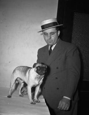 Orville Tunstill, with his dog, "Tunstill's Dirty Face." The Pug is one of 10 of the breeds now owned in Texas, seven of them being in Fort Worth, Texas. Tunstill will speak on the breed at the Fort Worth Kennel Club. He spent over a year trying to locate one of the breeds when he first became interested in them seven years ago. Mr. Tunstill is wearing a suit and hat. The dog is standing on a table.