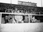 Army Air Forces Training Command (A. A. F. T. C.) Skymasters vs. 4th Air Force Fliers football game spectators. Front row, left to right, Mrs. Jacalu Cline, Corporal George Foster, Lieutenant Sam Rubenstein and Captain Ralph Yates. Back, Corporal Jay Jarnagin, Private Victor Waggoner, Private Frank Hurtig, Miss Novella Wilson and Lieutenant F. A. Bearly.