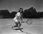 Catherine Greever is regarded as one of Fort Worth's best women tennis players. She has agreed to teach tennis classes under sponsorship of the Recreation Department. Miss Greever is pictured executing a backhand shot during a practice session on the tennis court. She is wearing a romper and tennis shoes.