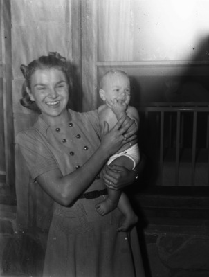 Mrs. F. L. Williams Junior with her six-month-old son, Allen Lee Williams, daughter and grandson of Glenn Allen, Ward County, Texas, rancher. They are pictured while the 1940 National Range Tour (June 24-28, 1940) members visited the Allen Ranch. Mrs. Williams is wearing a dress with two columns of buttons on the bodice and a belt at the waist. Allen Lee is wearing a diaper.