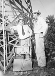 Aerial mappers. E. R. Henderson, left, Charlie Carruth and short wave radio set.