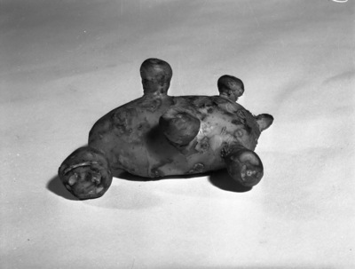 Photo of a potato shaped like a turtle. It was grown by E. O. Kizer. The "turtle" is lying on its back, with its legs in the air.
