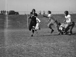 Bob Fenimore, number 55, Oklahoma Agricultural and Mechanical College's all-America halfback, eludes three Texas Christian University (TCU) tacklers and scampers 19 yards in the first quarter of the game. He was hauled in by TCU's Leon Joslin on the Frogs' 42 as the Aggies drove toward their second touchdown. Oklahoma won, 25-12, mainly on Fenimore's gains. Also pictured are TCU's Douglas Brightwell, number 54, and Beekman Ezell, number 85, right.