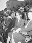 Spectators at the Texas Christian University (TCU) vs. Oklahoma Agricultural and Mechanical College (Oklahoma A&M) football game included Lieutenant Colonel Hawthorne Davis, center, and his wife, Mrs. Davis. They are sitting among other fans in the bleachers, watching the game. Lieutenant Colonel Davis is wearing his military uniform and Mrs. Davis is wearing a blouse, blazer, skirt and a hat.