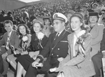 Lieutenant (junior grade) R. W. Rhoads, Latrobe, Pennsylvania, studying oriental languages at Oklahoma Agricultural and Mechanical College (A&M), yelled for the Aggies with Mrs. E. L. Waldrop, left, Wichita, Kansas, and Miss Betty Waldrop, A&M junior. Lieutenant Rhoads was injured in the kamikaze attack on the United States Ship (USS) Saratoga. He is wearing his military uniform. Mrs. Waldrop is wearing a dark-colored dress and a hat. Miss Waldrop is wearing a blouse and matching blazer and skirt. They are sitting in the bleachers, watching the football game against Texas Christian University (TCU) at TCU Stadium.