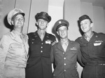 Wichita Falls Victory Bond Campaign Lost Battalion vets. Left to right, Captain Miley Dove, Plainview; Captain Eldon Schmid, Sergeant Riley Dove and Master Sergeant Ellis Dove. They are all in uniforms , smile and pose for a picture.