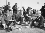 Wichita Falls Victory Bond Campaign Lost Battalion vets. Left to right, Brigadier General Preston A. Weatherred, Dallas; Governor Stevenson; Major General Fred L. Walker, and Brevet Lieutenant General John A. Hulen, Palacios. They all wear uniforms with hat, sit on the grass, eat and pose for a picture.