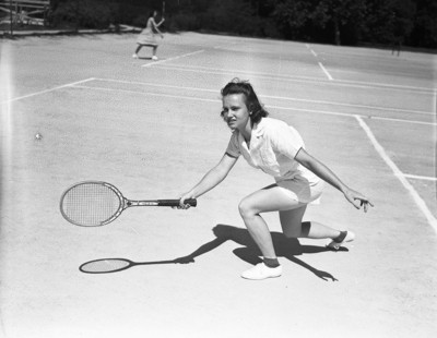Image shows Catherine Greever is regarded as one of Fort Worth's best women tennis players. She has agreed to teach tennis classes under sponsorship of the Recreation Department. Miss Greever is pictured executing a backhand shot during a practice session on the tennis court. She is wearing a romper and tennis shoes. Published in the Fort Worth Star-Telegram morning edition June 25, 1940.