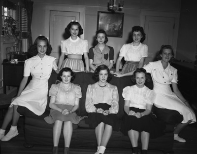 Officers of the W. A. W. Club at a meeting at the home of Miss Jean Hoera, 2009 Hill Crest. Seated, left to right, are Miss Rose Ann Pearson, vice president; Dorothy Hodges, parliamentarian; Billie Forman, president; Eugenia Kraft, corresponding secretary; and Elma Flo Alexander, recording secretary. Standing, left to right, are Miss Martha Hyer, pledge mistress; Cherry Kemble, business manager; and Vickie Moran, reporter. Miss Pearson, Miss Alexander and Miss Kemble are wearing dresses and the other officers are wearing blouses and skirts. Published in Fort Worth Star-Telegram, evening edition, July 8, 1940.