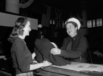 Mrs. Hallie Cook, Fort Worth policewoman, checking her coat at Service Men's Center with Miss Jane Dominge.
