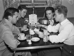 The Civil Aeronautics Authority training program is being offered to students at Texas Wesleyan College. Early bird students are reporting for instruction at 5:30 a. m. Tom Ross Neyland, right, is the flight instructor for the group. He is offering some pointers while they dine at the Airport Coffee Shop. The students are sitting around the table left to right Jack Morton, Ernest Barnes, and Lowell Rainwater.