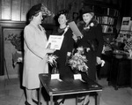 Mrs. Robert F. Stark, chairman, presenting ribbons to Mrs. R. E. Barr and Mrs. E. H. Abbott at the Fort Worth Garden Center chrysanthemum show.