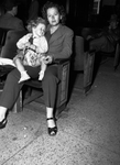 Mrs. Fayette Pierce and two years old daughter, Joyce Fay sitting in a terminal during a Greyhound bus strike.