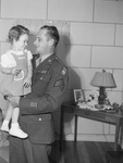 Picture took place at the home of ex-Sergeant Carl Zich and Mrs. Carl Zich, 3221 Lubbock. Sgt. Zich met for the first time his 2 year old daughter, Carol, when he returned home from two and a half years of service with the 5th Air Force in the Pacific Theatre. At the same his family saw him in his uniform for the first time since he entered the service in February 1943. Sgt. Zich was the son of Mrs. Helen Zich, 508 Hassett. He saw action in New Guinea and the Philippines' Leyte and Luzon. Sgt. Zich is carrying his daughter Carol, she appears to be wearing a dress. There is a small table in the background of the picture in which there is a lamp, teddy bear, a picture frame, and some other toys.