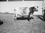 Southwestern Milking Shorthorn Association show winners. Cow owned by Howard and McWhorter of Lubbock. A man is holding a halter attached to a very large cow.