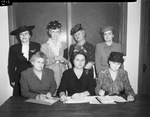Baptist Women's Missionary University arrangements committee seated, left to right, Mrs. R. D. Evans, Mrs. Clark M. Estes, Mrs. E. D. Head. Enoch E. Jones, Mrs. L. R. Elliott, Mrs. H. M. Young and Mrs. Paul W. Curtis. They wear dresses and some with hats, posing for a picture. Three sit and four stand behind.
