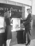 Miss Louise McKinney, Trinity State Bank employee, gets the willing aid of Marine Staff Sergeant R. A. Walker in putting up a poster proclaiming the 170th anniversary of the Marine Corps on November 10. Walker, a veteran of 27 months in the Pacific, is in the Marine Recruiting Officer here. Miss McKinney appears to be wearing a dress and Officer Walker is wearing his uniform. In the background of the picture you can see the front window of the Trinity State Bank.