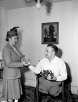Sergeant Bill Leonard, disabled veteran, buying poppy from Mrs. Gus Rahr Senior.