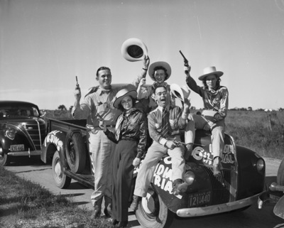 Over 100 Jacksboro, Texas, boosters visited Fort Worth, Texas, to promote the upcoming Jack County Historical Celebration at Jacksboro, Texas. Among the boosters were, left to right, Lewis Gray Johnson, co-chairman of the trip, Mrs. Johnson, Mrs. E. E. Henderson, Bowman Lewis, trip co-chairman, and Mrs. Buddy Boruff. They are gathered around and on top of an automobile. They are dressed in Western cowboy attire and are each holding a handgun.