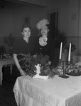 South Side Garden Club flower show winners. Mrs. Alvin Shepherd, left, was sweepstakes winner and Mrs. Helen Lawrence, right, was chairman of the fall flower show of the South Side Garden Club, held last week at Trinity Episcopal Church. In the picture you can see both women wearing dresses and standing behind the table. Mrs. Lawrence is wearing a fluffy hat and a corsage in the center of her dress. There are some plants and flowers in the table and a candle stand.