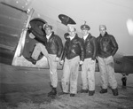 Victory Field, Vernon. Surplus planes. Left to right, Lieutenant (junior grade) W. Lloyd, Lieutenant (junior grade) B. W. Jarvis, Lieutenant H. E. Cave, Lieutenant W. W. Carpenter. Clipping photograph caption: Delivery Surplus Planes. Leaving Victory Field, Vernon , for the Grand Prairie Naval Air Station after delivering surplus Navy planes are, left to right, Lt.(jg) W. Lloyd, Lt.(jg) B.W. Jarvis, Lt. H.E. Cave, Lt. W.W. Carpenter. Clipping title: Used Planes Cheaper Than Used Cars At Vernon's Victory Field Sales Lot Range From $590 To $8,500. It's one of those post-war paradoxes, but you can buy a used plane cheaper than you can a used automobile, if you have any use for a plane! C.C. Grady, the RFC's (Reconstruction Finance Corporation) used plane salesman at Victory Field, has more than 800 planes for the buyer to choose from and they range in size from a two-seater open cockpit biplane trainer to a dive-bomber or a twin-motored, five-place Cessna cabin job. "We've sold about 100 in the last three weeks and the buyers are still coming, rain or shine," Grady laughed. Published morning edition November 25, 1945. Photograph of four soldiers posing in front of an airplane. They are all wearing leather jackets and military uniforms.