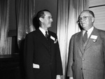 Texas Mid- Continent Oil and Gas. Fred W. Shield, San Antonio, left, and Maston Nixon, right, Corpus Christi. Clipping photograph caption: New President-Fred W. Shield, San Antonio, left, Friday was elected president of the Texas Mid-Continent Oil and Gas Association succeeding Maston Nixon, right, Corpus Christi, who has held the position for two years (Staff Photo). Photograph of two men dressed in business suits. The man on the left is wearing a dark colored suit and the man on the right is wearing a gray colored suit. Both men are wearing glasses.