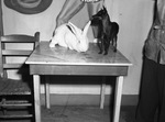 Dog and rabbit. "Lilac Farm Starlet," toy Manchester terrier owned by Mrs. Lourene Wishert of Bennet, Neb. The rabbit is owned by Hunt's Flemish Rabbitry of Oklahoma City. Clipping photograph caption: Starlet Was A Lady-Much too much of a lady to chase a "wabbit" - or was it because the rabbit out-weighed her by 10 pounds. Starlet, whose real name is Lilac Farm Starlet, is a 1-year-old toy Manchester terrier owned by Mrs. Lourene Wisher of Bennet, Neb. An entry in the dog show here, the little black canine weighs four pounds. The big white bunny with the pink eyes and ears that fearlessly crouched beside Starlet is an entry in the rabbit show. Valued at $35, the rabbit is owned by Hunt's Flemish Rabbitry of Oklahoma City. (Staff Photo.) Photograph of a large, white rabbit and a very small, thin, black dog. The dog is a Manchester terrier. Both animals are standing next to each other on top of a small table.