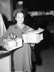 Mrs. Lee Conway appears to be shopping for Christmas. She is happy holding some three wrapped packages with bows. Mrs. Conway is wearing a long coat and she has her hair up.