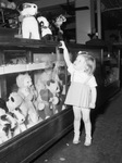 Jacquelyn Carroll, 2, looking at dolls and Christmas shopping with her parents Mr. and Mrs. J. L. Carroll Jr. Young Jacquelyn is reaching for the toy she wants Santa Clause to bring her. Young Carroll appears to be wearing a skirt overall with a white collared shirt and a bow in her hair.