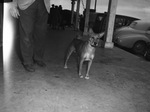 "Hongo Kongo of Hallwyre," best of breed at the recent Fort Worth Kennel Club dog show, is a good representative of the modern Basenji dog breed. He is standing on a sidewalk, with no collar or leash. An unidentified man (waist down) is standing at left.