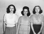 Girls to be presented at Temple Beth-El Ball at the Blackstone Hotel. These girls, left to right, Miss Norma Jo Abrameson, Miss Gloria Myers and Miss Louise Rubenstein are to be escorted to the Victory ball at the Blackstone Hotel. The three girls are standing up against a wall.