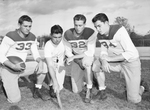 Coach M. M. Harris, coach at Handley High School, charts defensive formations for three Handley Greyhounds for their district 14-A game at Farrington Field against the defending champion Diamond Hill team. They are, left to right, Don Powers (34), co-captain and quarterback; Coach Harris; Ruel Austin (32), left half; and Bob Barron, captain and right end. All three are seniors. They are all kneeling on the grass, looking at the formations chart. The players are in their uniforms and Coach Harris is wearing a t-shirt and sweatpants.