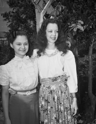 Miss Helen Ketchum, left, daughter of Mr. and Mrs. J. E. Ketchum, with her guest, Miss Beth Rowell, of Chattanooga, Tennessee. The girls attended the Methodist Young People's Assembly in Georgetown, Texas, on June 17, 1940. They are standing outdoors. Miss Ketchum is wearing a short-sleeve blouse and a skirt. Miss Rowell is wearing a long-sleeve blouse, a floral print skirt and a beaded necklace.