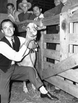 G. Borgo Bilia, Mexican 4-H Club boy from Hermosillo, Sonora, Mexico, offers a cigarette to goat at Fort Worth stockyards. In the picture you can see Mr. Bilia wearing a long sleeve white collared shirt, tie, and a vest. He is sustaining the face of the goat and in between his fingers he has a cigarette.