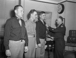 Major General James P. Hodges, right, congratulations Colonel William L. Kennedy. On the left is Captain John S. Van Epps, and second from left is Major William H. Jones-Burdick. Clipping photograph caption: Training Command Officers Decorated-Major General James P. Hodges, extreme right, acting commanding general of the AAF (Army Air Forces) Training Command, congratulates Colonel William L. Kennedy at the close of ceremonies when the general decorated Kennedy and two other AAF Training Command officers. Photograph of four men in an office. All are dressed in military uniforms.