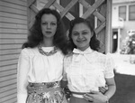 Left to right, Beth Rowell and Helen Ketchum, daughter of Mr. and Mrs. J. E. Ketchum. Miss Rowell was a guest of Miss Ketchum after the girls attended the Methodist Young People's Assembly in Georgetown, Texas, on June 17, 1940. They are standing outdoors. Miss Ketchum is wearing a short-sleeve blouse and a skirt. Miss Rowell is wearing a long-sleeve blouse, a floral print skirt and a beaded necklace.