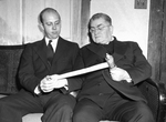 A scroll from Palestine with the book of Esther inscribed on parchment and encased in Acacia wood is shown by Doctor Nathan Cohen Beskin, right, former schoolmate of Stalin, here to conduct evangelical services, to Reverend Raymond Roller, pastor of the Free Methodist Church where meetings are being held. Both men appear to be wearing suits and eyeglasses and they are sitting in a couch.