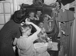 Crowded family. Mrs. Sager and children looking in to mirror. There's a traffic jam around the Sager's one dresser in the mornings as the family gets ready for the day's activities. Lining up with Mrs. Sager for mirror inspection, bottom are left to right, Jack Ervin, Ben Royden, Charles Ray, and Alice Faye. In the picture you can see the group of children and their mother in front of the dresser's mirror.