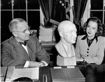 Electra Waggoner Biggs with President Harry Truman and the sculpture she made of Truman, 11/15/1945
