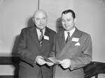 Dr. J.W Foy left, of Seymour president of the Northwest Texas District Medical Society in session Thursday at Hotel Texas and Dr. Joe R. Wise, Fort Worth, the organization's secretary treasurer, study the convention program. In the picture you can see both men wearing suits and they are holding a small booklet.