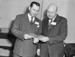 Northwest Texas District Medical Society meeting attendees include Doctor J W. Foy (right) of Seymour, Texas and Doctor Joe R. Wise, Fort Worth, Texas. In the picture you can see both men wearing suits and looking at a small booklet.