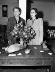 In charge of the Highland Park Garden Club annual flower show Friday were Mrs. Rose Harwell, co-chairman and Mrs. A. W. Holmes, chairman. Mrs. Harwell and Mrs. Holmes are wearing coats and are standing behind a bouquet of flowers on a table.