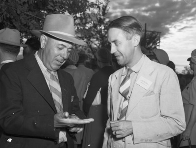 Members of the 1940 National Range Tour visited ranges and ranch homes in Texas. Among those on the tour were, left to right, George Samson, of Post, Texas, county farm agent, and Whitney Therin, head of Agricultural Adjustment Administration (AAA) information department at Washington, D. C. They are standing outdoors. Mr. Samson is wearing a dark-colored suit with a striped necktie and a hat. Mr. Therin is wearing a lighter suit and a striped necktie.