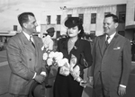 Left to right, Doctor and Mrs. Ramiro Collazo of Havana Cuba, and Doctor E. R. Ammons. Dr. Collazo is the President of Lions International. Dr. Ammons, district Lions governor, met Dr. and Mrs. Collazo during a brief stopover at Municpal Airport. Dr. Ammons present a bouquet of yellow mums to Senora Collazo.