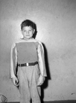 Dexter Peacock, is the last son of Mr. and Mrs. W.G. Peacock to play on Poly's High School's football team. The school is not to run out of the name during the first seven years of the Atomic Era. When 1953 rolls around, all seven of the Peacock boys, will have represented Poly High in District 7-AA grid games. A Peacock will be on the team through 1952. Dexter's older brothers; Buddy, Weldon, and Kenny were all discharged from the Navy. Dexter appears to be standing in front of a wall and he is wearing a long sleeve striped shirt, pants, and a belt.