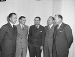 After military service these men have returned to their jobs in the Fort Worth production office with Gulf Oil Corporation. Navy veterans dominate this group, left to right, A. V. Erickson, T. A. Crocker, N. I. Morgan and E. J. Chandler and Doyle S. Wilson. Chief yeoman Erickson is wearing a double breasted suit. Marine first lieutenant Crocker is wearing a light-colored double breasted suit. Yeoman second class Morgan is wearing a double breasted pinstripe suit. Flight officer Chandler is wearing a three piece suit. Yeoman, first class Wilson is wearing a three piece pinstripe suit. The men are standing next to each other. Published in the Fort Worth Star-Telegram evening edition, December 2, 1945.
