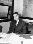 Doctor Dan J. Anderson, state veterinarian for Livestock Sanitary Commission. In a new post, Dr. Anderson been appointed state veterinarian. He succeeds Dr. E. A. Grist who accepted a position with the A&M College Extension Service. Mr. Anderson appears to be wearing a suit, patterned tie, and striped suit. He is sitting in his desk and there are a couple of documents displayed in his desk.