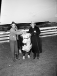 Charles Pettit of Flat Top Ranch, Walnut Springs, left, and C. A. Smith of Chester West Virginia ( right) shown with two year old heifer. Mr. Pettit congratulated Mr. Chester on the purchase of the heifer for $10,000. The Hereford was the first to sell for that price in Texas. Both men are wearing hats; Mr. Smith is wearing a long coat and eyeglasses.